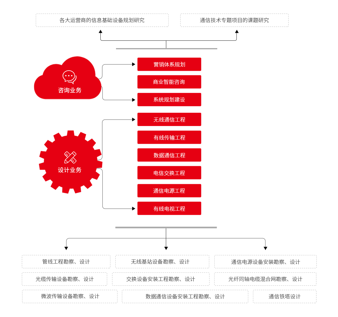 為客戶提供通信網(wǎng)、計算機(jī)網(wǎng)、廣播電視網(wǎng)等網(wǎng)絡(luò)的設(shè)計咨詢服務(wù);為通信企業(yè)提供綜合發(fā)展規(guī)劃、戰(zhàn)略規(guī)劃 專題規(guī)劃、業(yè)務(wù)咨詢及管理咨詢等咨詢服務(wù)。公司擁有工程設(shè)計、工程勘察等國內(nèi)通信設(shè)計領(lǐng)域的頂級資質(zhì);優(yōu)質(zhì)的服務(wù)質(zhì)量,快速的業(yè)務(wù)響應(yīng)能力、標(biāo)準(zhǔn)化、規(guī)范化的服務(wù)流程以及優(yōu)秀的工程設(shè)計項目質(zhì)量為公司在業(yè)界取得良好的口碑。