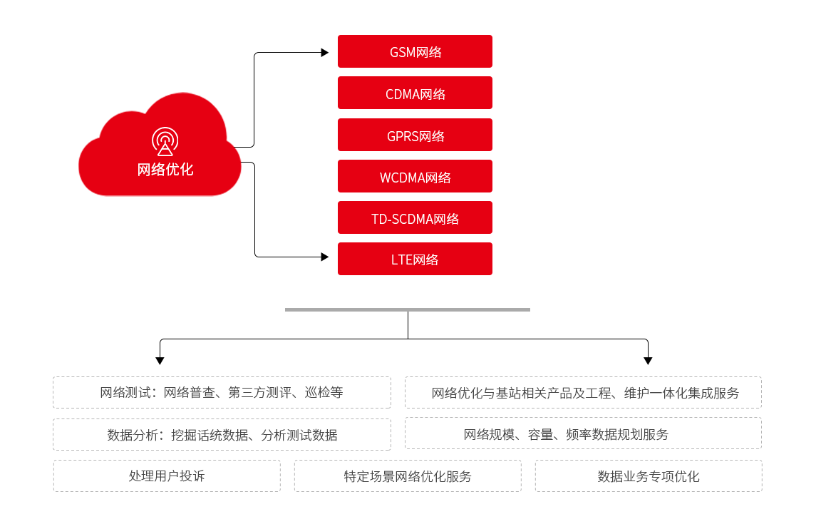 公司具有專業(yè)的網(wǎng)絡(luò)優(yōu)化分析團(tuán)隊(duì),具備多廠家、多運(yùn)營(yíng)商的綜合性網(wǎng)絡(luò)優(yōu)化能力,針對(duì)GSM、CDMA、TD-SCOMA、WCDMA、LTE等多種制式的無(wú)線網(wǎng)絡(luò),提供整體的優(yōu)化解決方案,包括建網(wǎng)初期相后期擴(kuò)容工程的工程網(wǎng)絡(luò)優(yōu)化服務(wù)、運(yùn)維期間的日常網(wǎng)絡(luò)優(yōu)化服務(wù)、階段性分析解決網(wǎng)絡(luò)瓶頸的專項(xiàng)網(wǎng)絡(luò)優(yōu)化服務(wù),通過(guò)測(cè)試數(shù)據(jù)分析、話統(tǒng)數(shù)據(jù)分析,結(jié)合天饋線系統(tǒng)優(yōu)化、無(wú)線參數(shù)優(yōu)化話務(wù)均衡等方式,對(duì)網(wǎng)絡(luò)性能指標(biāo)進(jìn)行優(yōu)化提升,最終達(dá)到提高網(wǎng)絡(luò)質(zhì)量以滿足終端用戶需求及提升網(wǎng)絡(luò)設(shè)備利用率的效果。